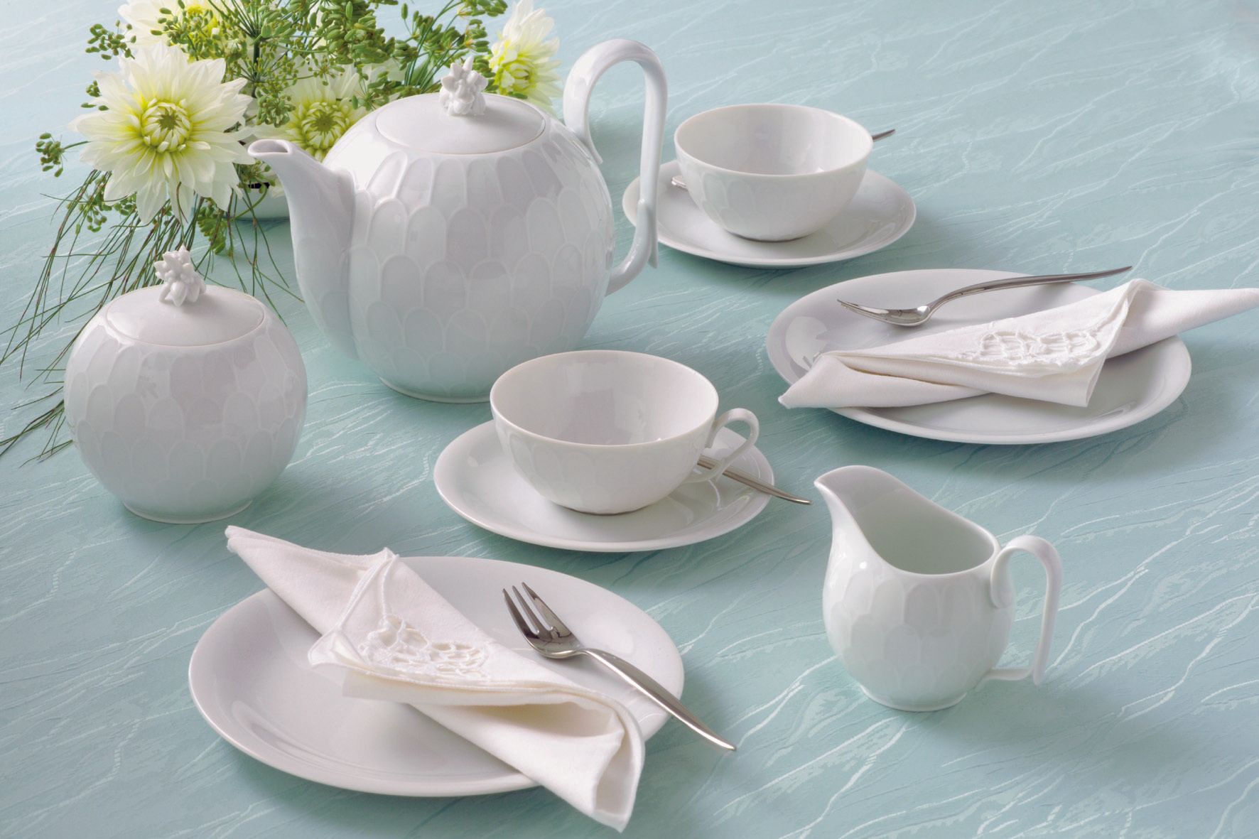 Für die Teestunde produziert Augarten das 1930 von Hoffmann entworfenen Teeservice „Atlantis“ in reinem Weiß. Die charakteristische schuppenartige Oberfläche und die ausdrucksvolle Form rücken so in den Fokus.